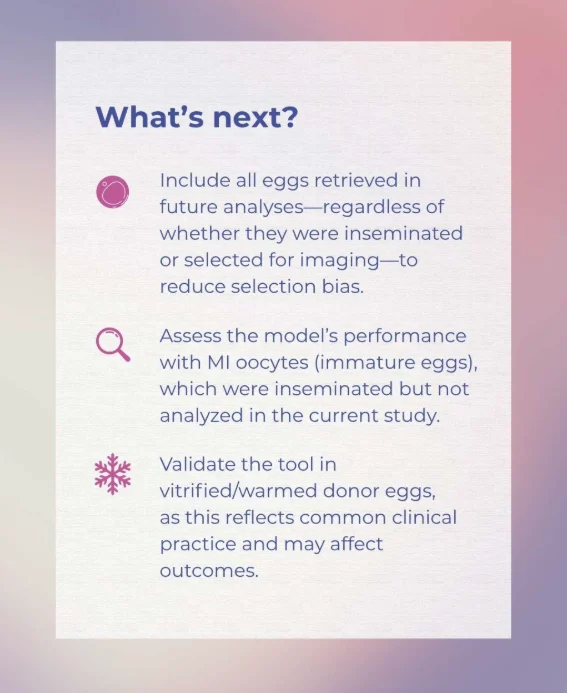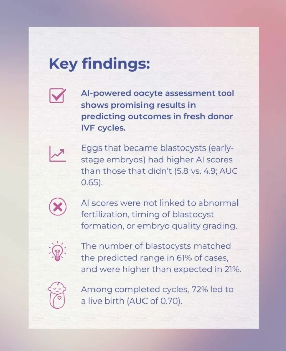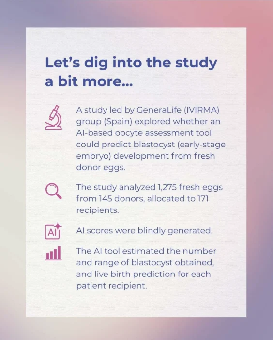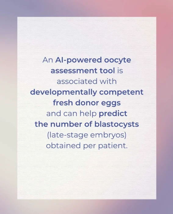 “This week we are reviewing an ESHRE 2025 abstract featuring a prospective study led by GeneraLife IVF across three clinics in Spain. The study evaluated the use of our AI-powered oocyte assessment tool in fresh donor egg cycles, exploring its ability to predict blastocyst development and support better management of donor egg programs. This validated model now powers our ROSE oocyte quality assessments for donor eggs.