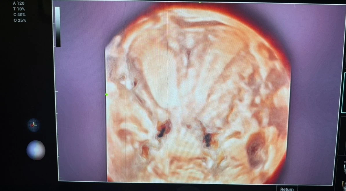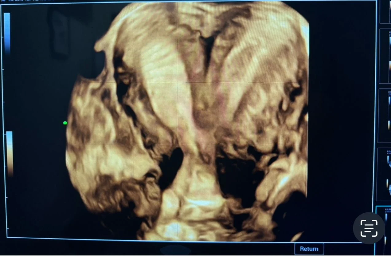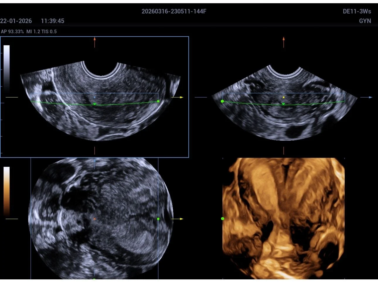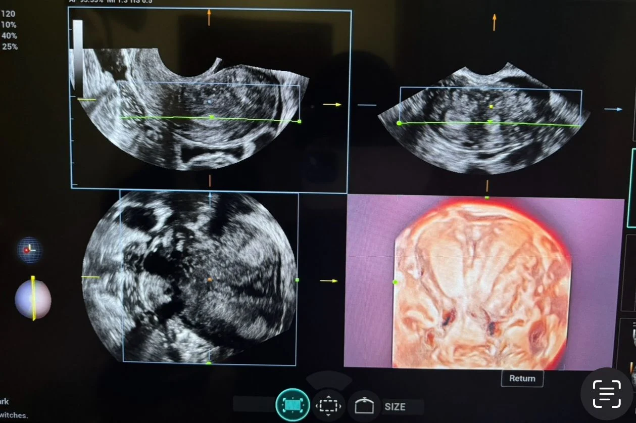 A 3D transvaginal ultrasound examination revealed a congenital uterine anomaly consistent with a bicornuate uterus with features suggestive of uterus didelphys.