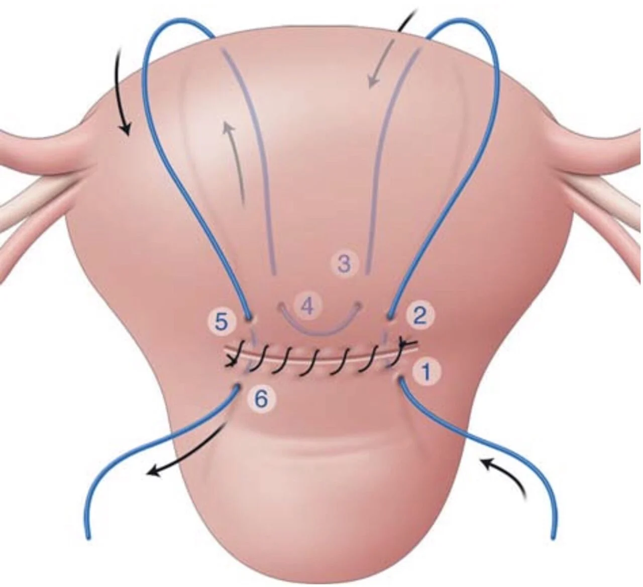 “AJOG Expert Review in Cesarean: Management of immediate and delayed postpartum hemorrhage with cesarean delivery – B-Lynch’s technique of uterine compression by complication performed after uterine closure. The blue line illustrates the suture’s path, with the numbers indicating the order of the needle’s passage.”