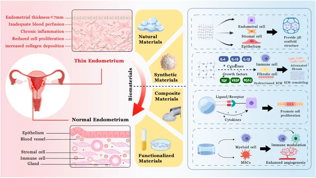 Recent research highlights advances in using biomaterials to repair thin endometrium, a condition that can significantly impact fertility outcomes. The review discusses how collagen-based scaffolds and ECM-mimicking hydrogels help recreate the native uterine microenvironment, supporting cell adhesion, vascularization, and tissue regeneration.