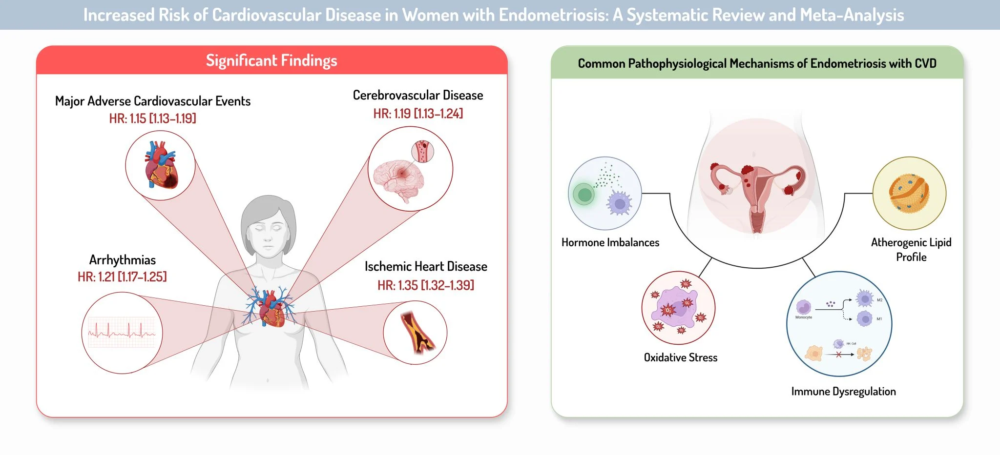 Our study, published in the European Journal of Obstetrics and Gynecology and Reproductive Biology, analyzed data from nearly 1.5 million women across multiple countries. The results reveal a concerning pattern: women with endometriosis face significantly higher risks of stroke, ischemic heart disease, arrhythmias, and major adverse cardiovascular events.