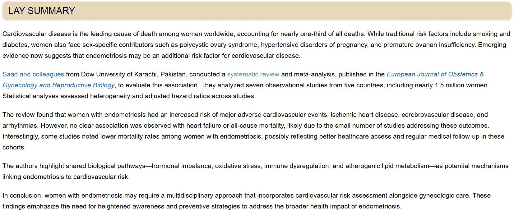 “I’m honored to share that the recent paper I led, ‘Increased Risk of Cardiovascular Disease in Women with Endometriosis: A Systematic Review and Meta-Analysis,’ has been covered by EndoNews, one of the world’s leading platforms for evidence-based updates in endometriosis research.