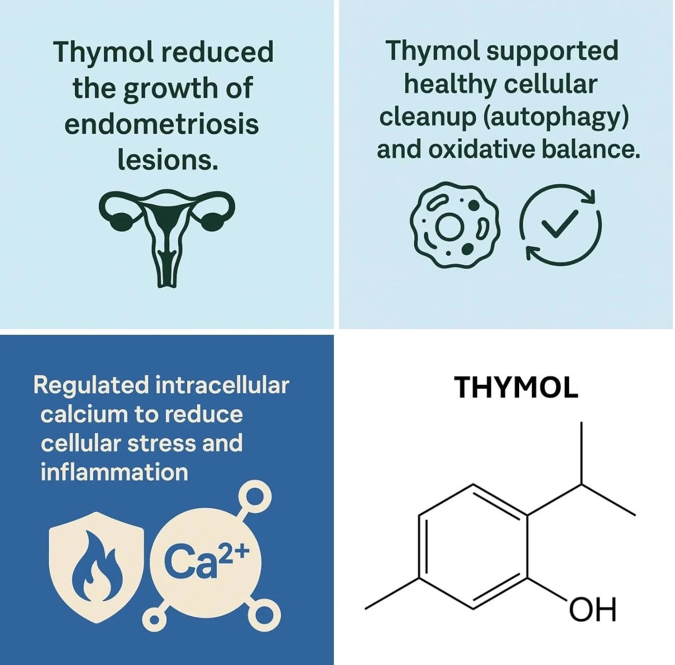 Researchers tested thymol both in lab-grown endometriosis cells and in a preclinical model of ingesting thymol, and the results were impressive.