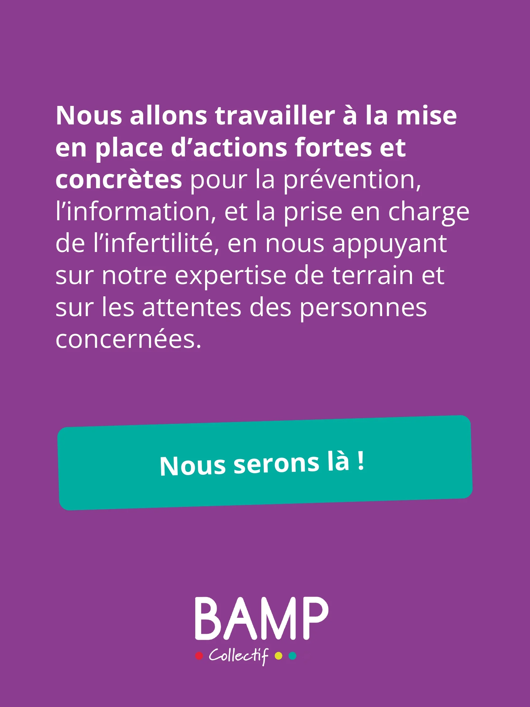 We will work to implement strong and concrete actions for the prevention, information, and management of infertility, based on our expertise in the field and on the expectations of the people concerned.