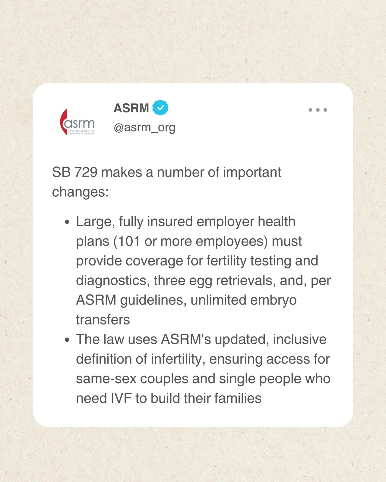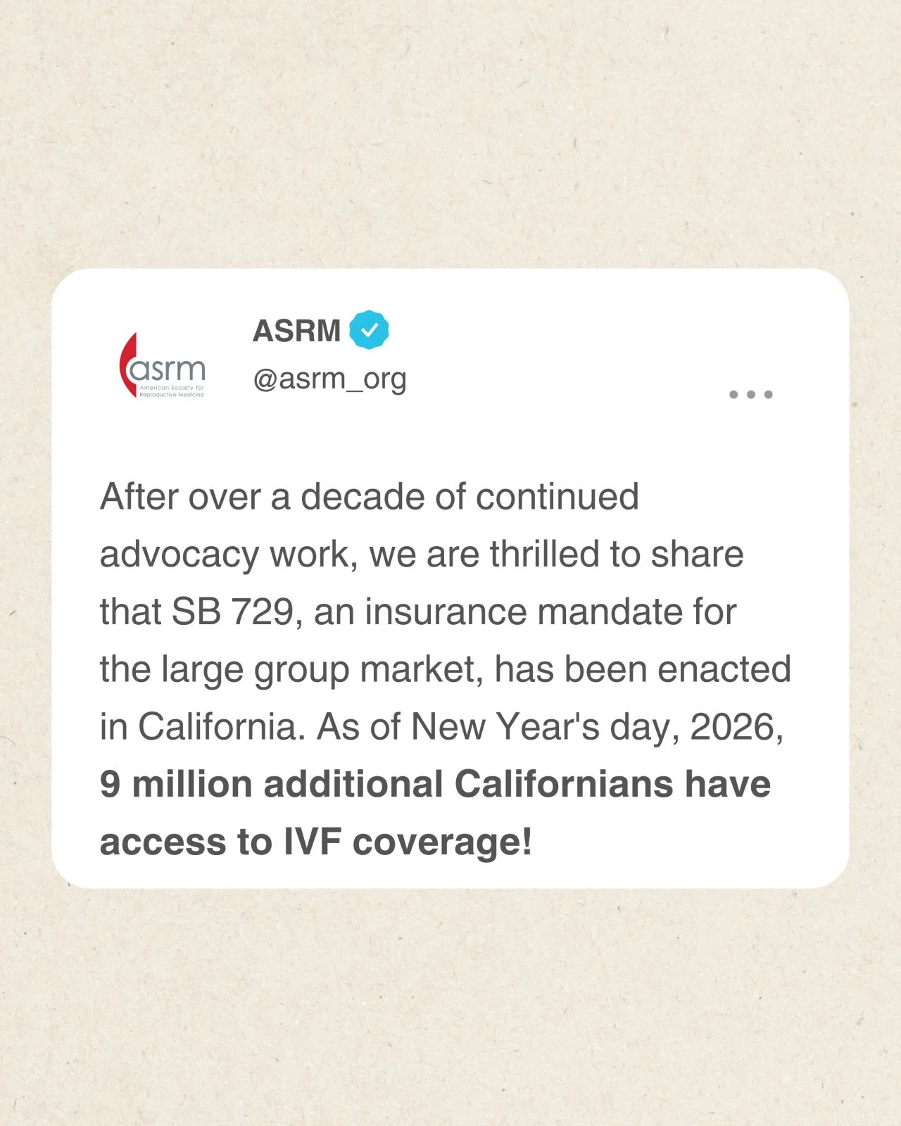 “A huge win for fertility access in California! After more than a decade of advocacy, SB 729 is now law, bringing IVF coverage to 9 million more Californians starting January 1, 2026. This milestone expands access, uses ASRM’s inclusive definition of infertility, and helps more families build the futures they deserve. Thank you to every advocate who called, shared their story, and showed up. Your voices made this possible.”